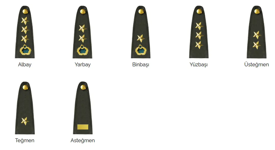 İsim aynıdır, apolet ve renk detayları farklılık gösterebilir. Görev yetkileri kuvvete göre değişir.