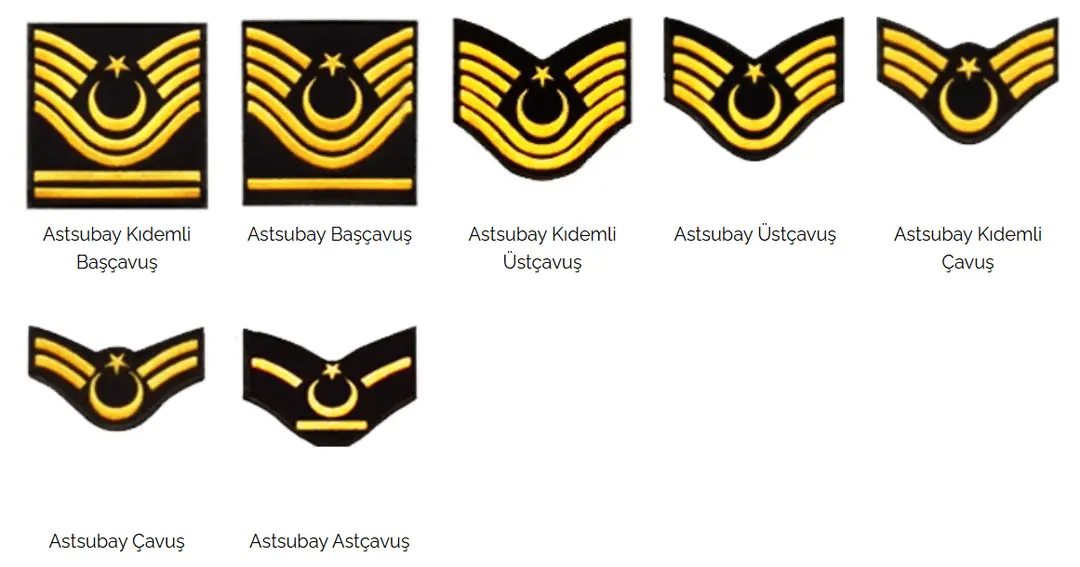 | Astsubay | NCO / WO | Starshina | Feldwebel | Warrant Officer | Adjudant |